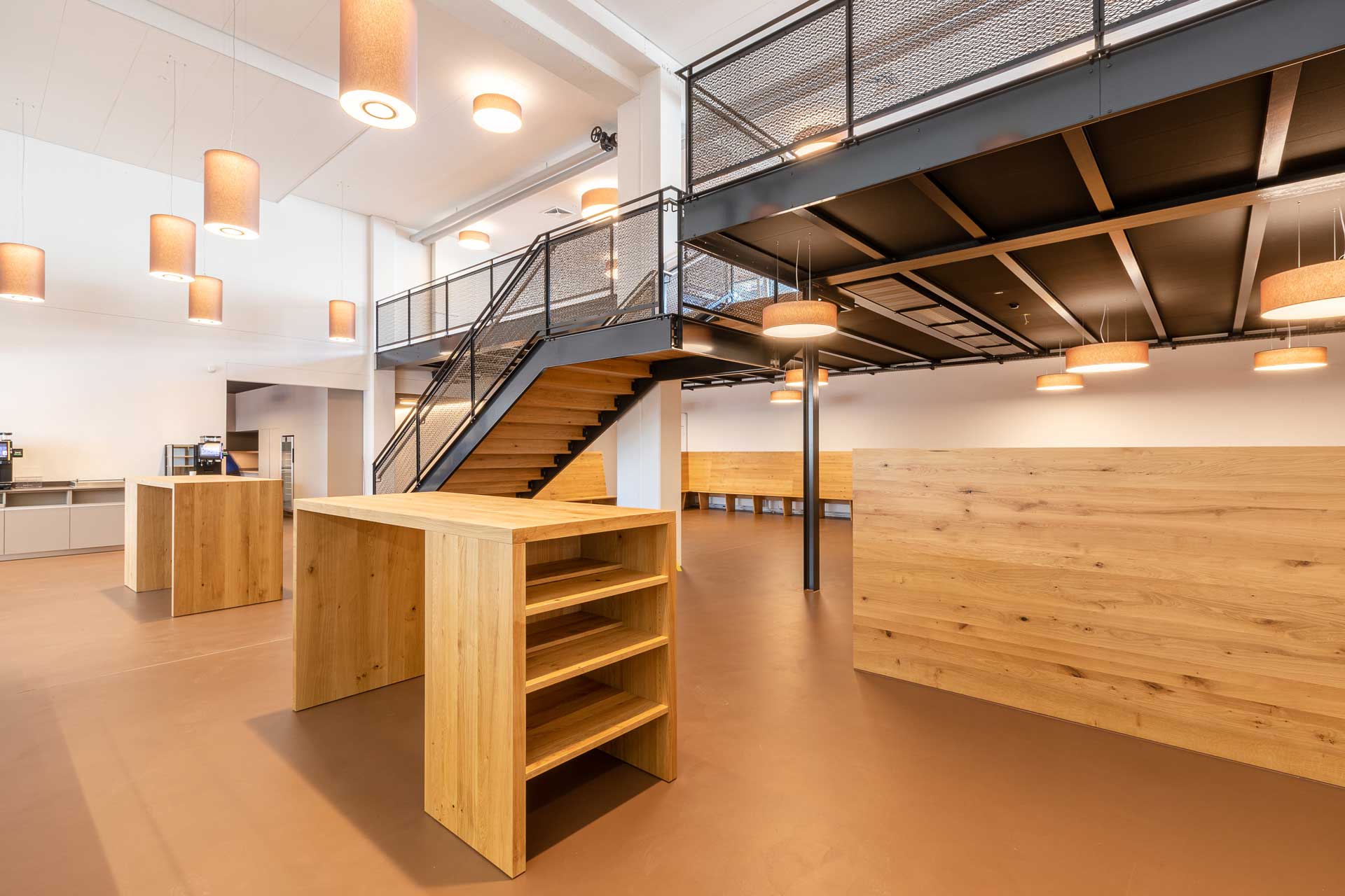 Das in enger Zusammenarbeit mit der Bauherrschaft entwickelte Konzept zielte darauf ab, Materialien auszuwählen, die den Mitarbeiterinnen und Mitarbeitern in ihren Pausen eine angenehme und entspannte Pausenatmosphäre bieten. Ästhetik, Nachhaltigkeit, Funktionalität und eine gute Akustik standen dabei im Vordergrund.